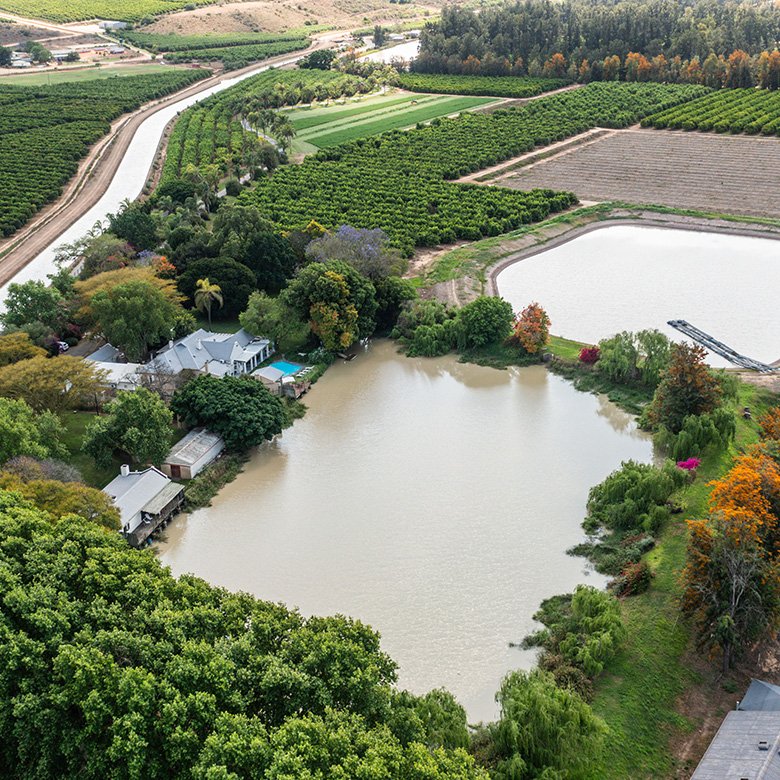 A peaceful African oasis overlooking the dam, pool, and lush gardens, set on a citrus farm near Addo Elephant National Park.