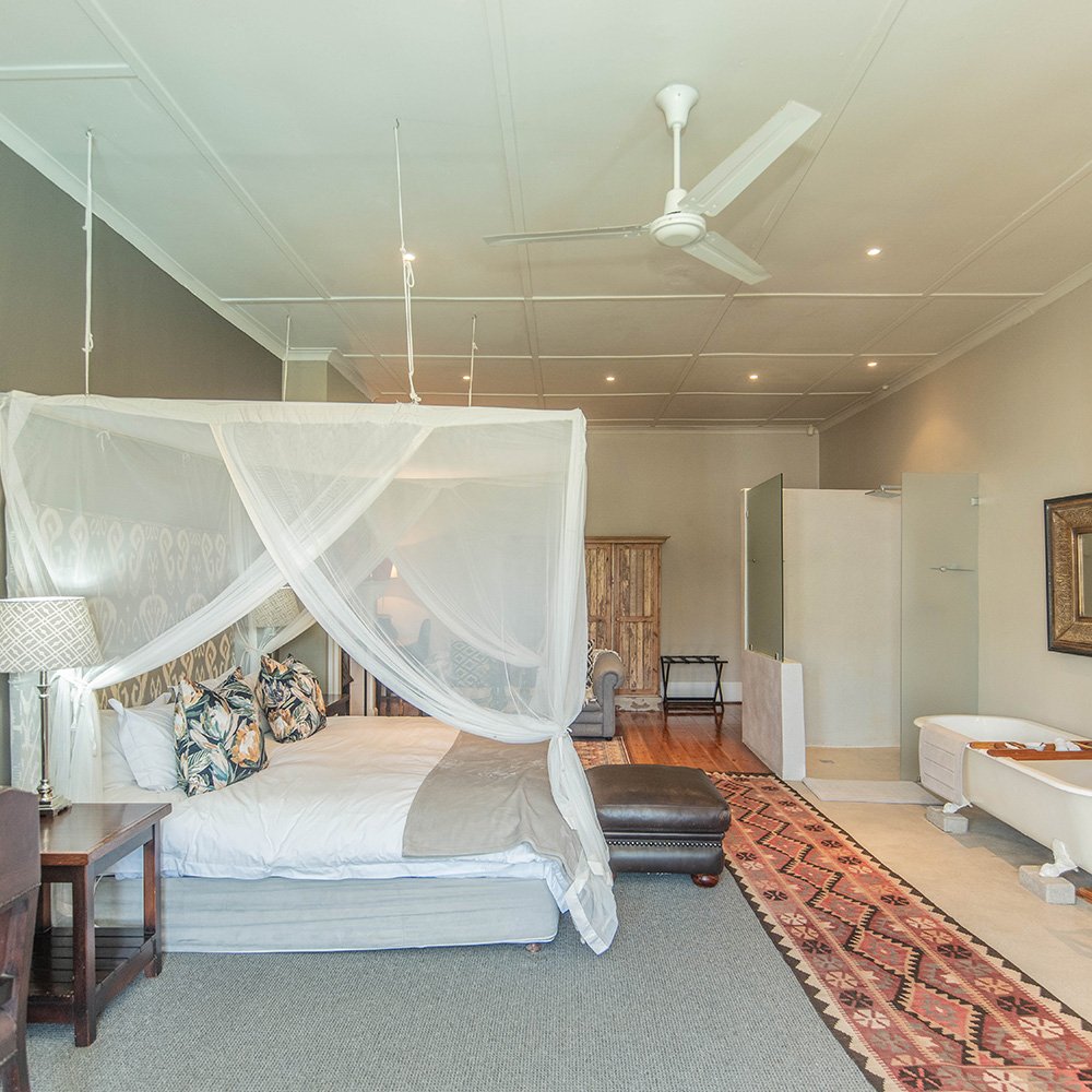 This open plan room offers stunning views over the swimming pool area and dam. The room has its own seating area as well as a desk for working.