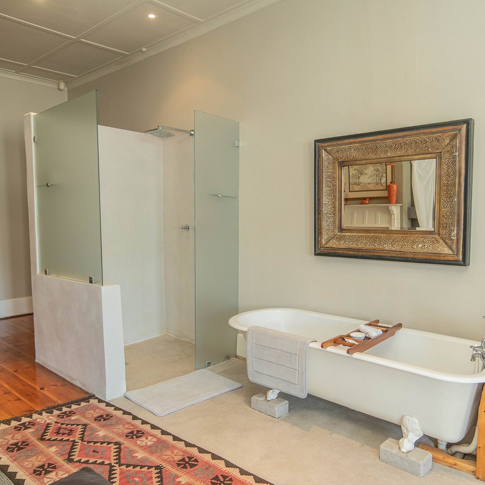 The bath and shower are open-plan to the bedroom. Please note the W/C is also open to the room, enclosed by sliding wooden doors